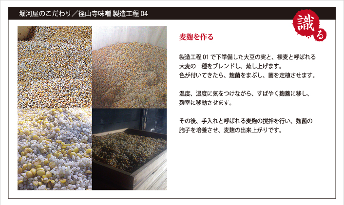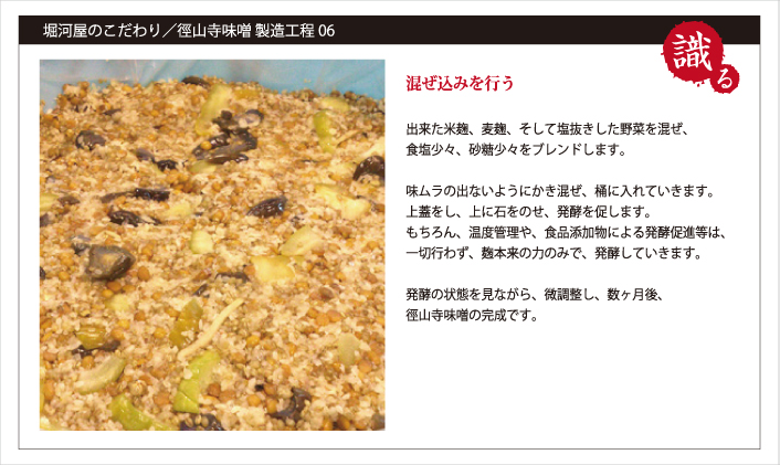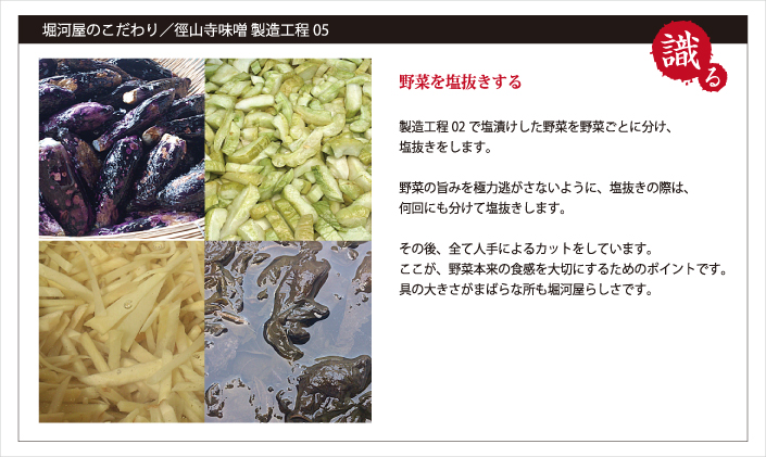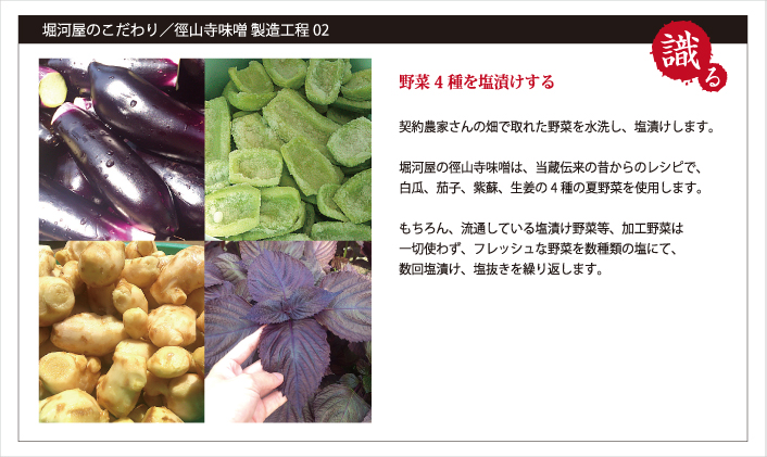 夏野菜を契約農家さんと相談し、ともに育て、ともに収穫する。朝取りの夏野菜を長年培ってきた堀河屋の仕法で何度も塩漬けする。もちろん麹作りは米麹、麦麹、ともに手作業。こちらでは、徑山寺味噌の製造工程をご紹介します。